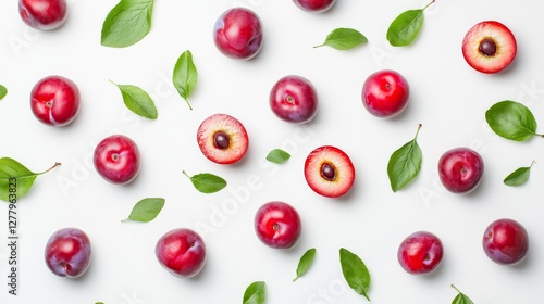 Red plums with green leaves, halved, on a white background.