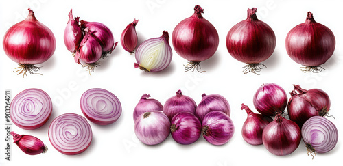 Red purple onion onions vegetable, many angles and view side top front cluster group slice cut isolated on transparent background cutout, PNG file. Mockup template for artwork graphic design
