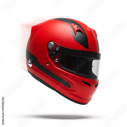 falling, helmet, red, black, stripes, safety, motorsport, racing, equipment, gear, isolated, white background, nobody, single, object, studio shot, clean, simple, design, modern, contemporary, motion, dynamic