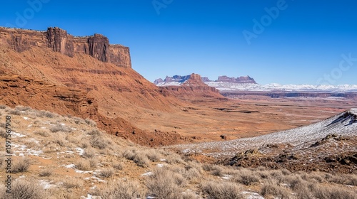 canyon, red, rock, mountain, desert, landscape, vista, peak, vale, snow, winter, sunlight, dry, arid, rocky, hill, rugged, nature, panorama, view, distance, horizon, colours, texture, elevation, altitude, geologic, formation, basin, sparse, vegetation, brown, beige, orange, pastel, clarity, sharp, majestic, wild, huge, stunning, dramatic, wilderness