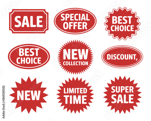 red, sale, discount, label, badge, retail, promotion, e-business, marketing, campaign, offer, special, deal, price, tags, shopping, store, business, clearance, savings, advertise, commercial, highlight, attention, design, product, vector, illustration, concept