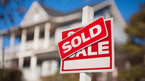 Red sold sign on a real estate for sale sign in front of a blurred suburban house.