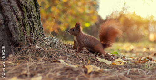 Red squirrel plays among autumn leaves. Sciurus vulgaris.