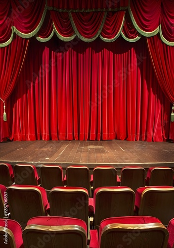 Red Stage Curtain and Empty Seats in Theater