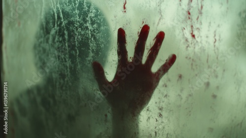Red stained droplets on foggy glass with a vague human shadow and five-fingered hand reaching out