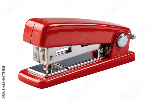 stapler, red, office, stationery, metal, compact, portable, desktop, tool, equipment, supply, document, paper, binding, fastening, clip, business, work, functionality, mechanism, contraption, practical, efficient, useful, simple, modern, small, device, blood-red, metallic, hardware, accessory, ergonomic, design, workplace, product, image, isolated, photo, electronic