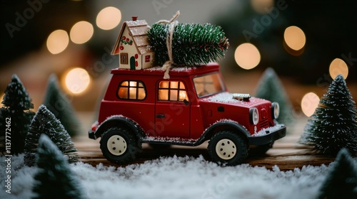 Red Toy Car Carrying Christmas Tree and Miniature House in Snowy Winter Scene