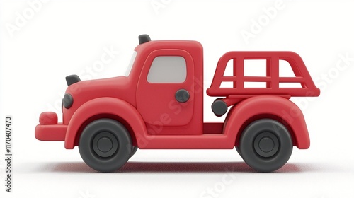 Red toy firetruck side view, white background, 3D render, children's illustration