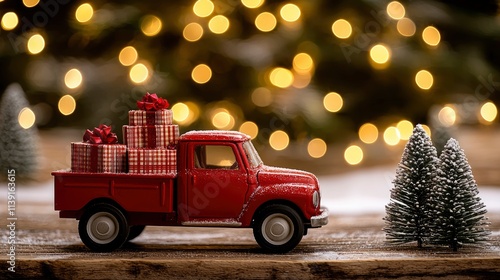 Red Toy Truck Delivering Christmas Presents Against a Sparkling Lights Background