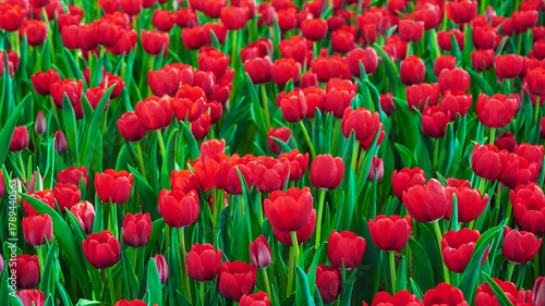 Red tulip flowers blooming on the field in spring. Beautiful natural floral background