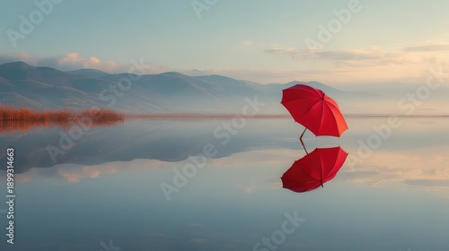 umbrella, lake, mountain, serene, calm, water, red, surreal, landscape, nature, cloudy, sky, peaceful, background, float, stillness, beauty, scenery, environment, calmness, majestic, cloudy sky, artistic, visual