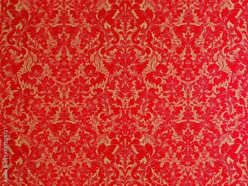Red wallpaper featuring a classic damask pattern in a rich and luxurious design, vintage, intricate