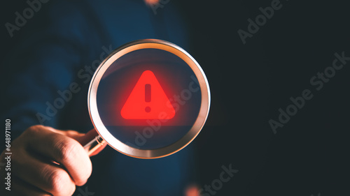 Red warning icon on a magnifying glass lens held by the businessman hand.