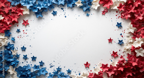 Red, white and blue stars frame the background with copy space in the center. The concept of a USA national holiday celebration.
