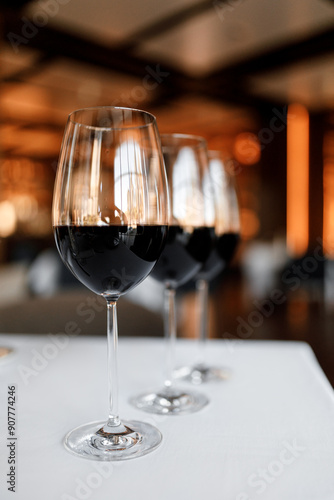 Red wine in a glass on a beautiful white tablecloth in a nice restaurant
