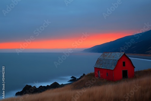 sunset, seascape, barn, red barn, coastal, ocean view, dramatic sky, mountain, silhouette, rustic, rural scene, peaceful, tranquil, dusk, twilight, coastline, landscape, nature, scenic, agriculture, farm building, countryside, atmospheric, golden hour, maritime, oceanfront, beach house, nordic, scandinavian, wilderness, remote, solitude, meditation, mindfulness, wanderlust, travel destination, adventure, exploration, shoreline, seaview, waterfront, minimal, simplicity