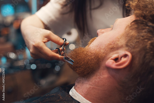 Red-haired bearded man sitting in barbershop and female barber making hairdo to guest