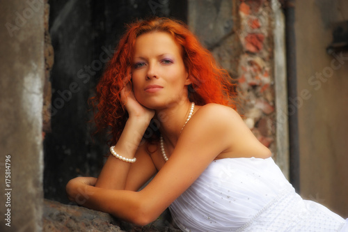 red-haired bride next to a ruined building