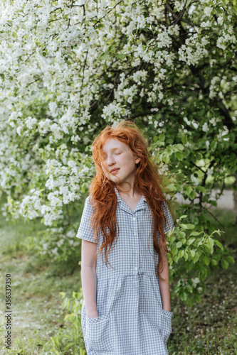 Red-haired girl enjoys a Sunny day