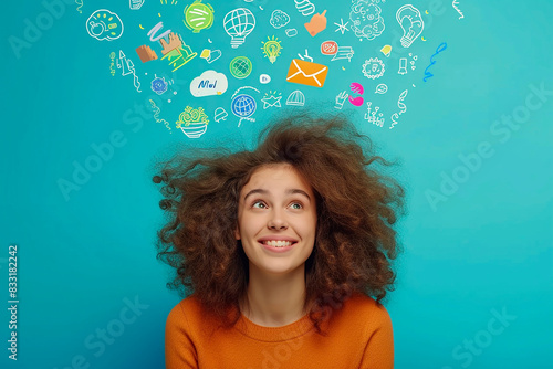 Red-haired woman with symbols and drawings in her head of ideas, IA