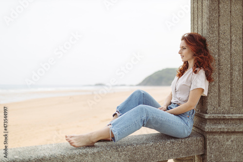 redhead, woman, sitting, retaining, wall, day, individuality, copy space, 1, people, travel, adult, journey, outdoors, spain, caucasian, casual attire, redheaded, architecture, barefoot beach, mindfulness, leisure, basque country, mid, comfortable, beach, contemplation, vacation, lifestyle, long hair, hair, female