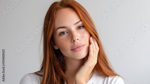 Redheaded woman with freckled skin softly caressing face, celebrating natural beauty against minimalist studio backdrop with soft lighting