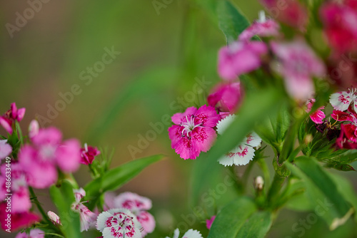 red-pink flower close-up grows in the summer cottage