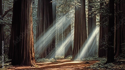 Redwood forest sunbeams, peaceful nature trail, serene background, poster print