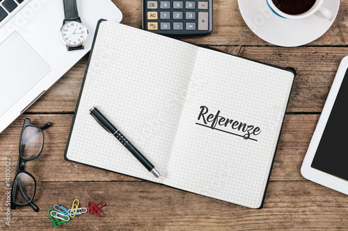 Referenze, Italian text for Referrals in notebook on office desk with computer technology, high angle