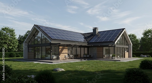 Refined eco-friendly residence with large solar plates installed, architectural masterpiece