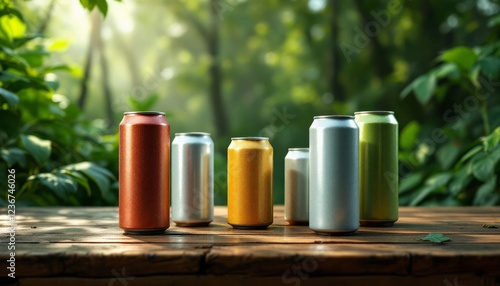 Refreshing Aluminum Cans in a Lush Green Forest Setting: A Summer Beverage Photography