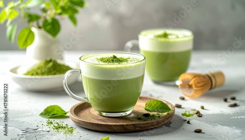 Refreshing and Vibrant Green Matcha Latte with Creamy Foam, Artfully Prepared with Whisked Japanese Green Tea Powder and Served in Stylish Glasses on a Rustic Setting