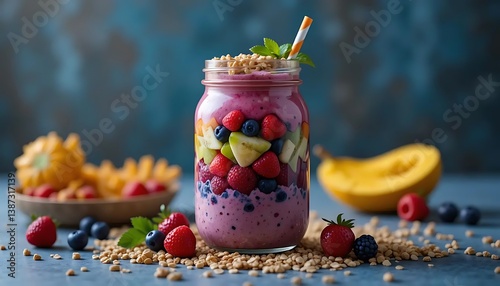 Refreshing Berry Smoothie in Mason Jar with Fresh Fruits and Oats
