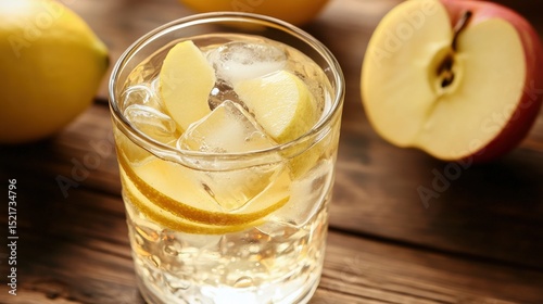 drink, glasses, beverage, lemon, apple, slice, ice, cube, wooden, table, fruit, closeup, cold, refreshing, summer, healthy, nourishment, water, transparent, clear, light, yellow, brown, fresh, mix, natural, composition, hydratation, ingredient, iced, tabletop, close, tasty, delicious, cool