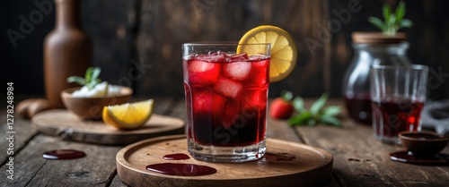 Refreshing Bloody Mary Cocktail with Ice and Lemon Slice on Wooden Table Rustic Setting