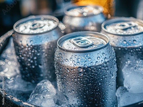 Refreshing chilled beverage cans in icy bucket on a sunny day