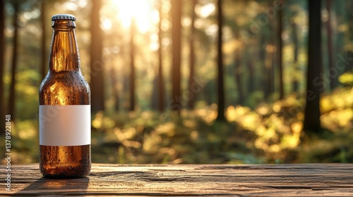 Refreshing cold beer bottle glistens with condensation on a rustic wooden table in a serene forest setting during golden hour