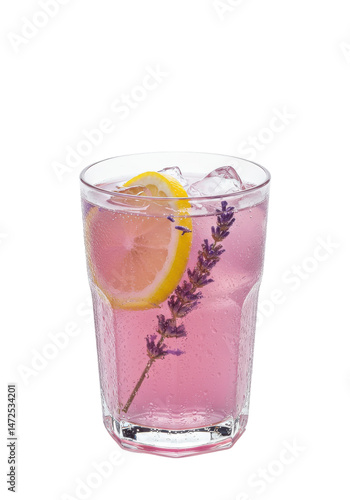 Refreshing drink with lemon slice and lavender sprig on ice in a clear glass