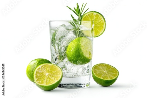 Refreshing Gin Tonic Cocktail with Lime and Rosemary Sprig on White
