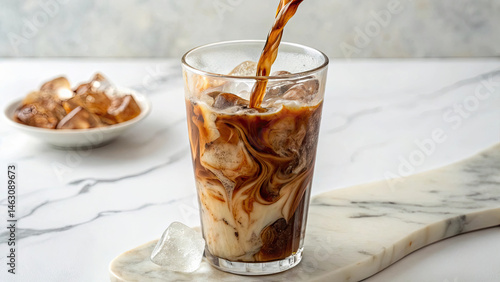 Refreshing glass of iced coffee with milk being poured, creating swirling effect, placed on marble surface with ice cubes and bowl in background