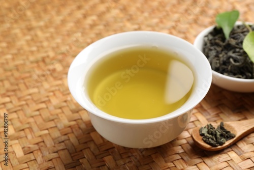Refreshing green tea in cup, spoon and leaves on table, closeup