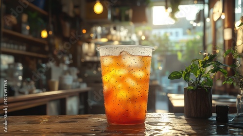 Refreshing iced beverage in a cozy caf? setting with warm lighting and greenery