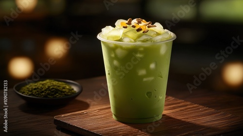 Refreshing iced matcha beverage local cafe product photography contemporary setting close-up view healthy lifestyle concept