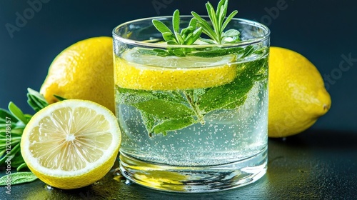 Refreshing lemon rosemary drink, close-up, dark background, healthy beverage