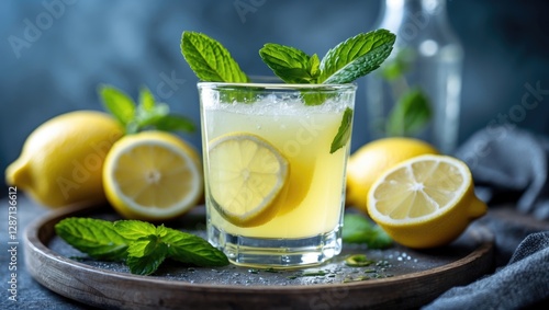 Refreshing Lemonade with Mint Garnish and Lemons on Dark Surface for Beverage Promotion and Recipe Ideas