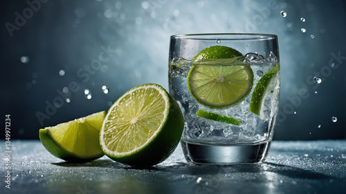 Refreshing lime drink with ice and lime slices splashing into glass