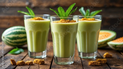 Refreshing Melon Smoothies with Mint Garnish on Rustic Wooden Table