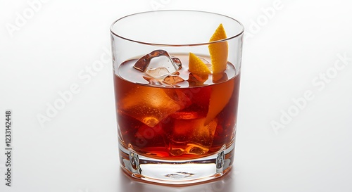 negroni, cocktail, orange, garnish, ice, drink, alcoholic beverage, aperitif, bitter, sweet, refreshing, stylish, bar, eatery, gin, red, brown, alcohol, ice cube, liqueur, receipe, constructed, party, celebration, food photography