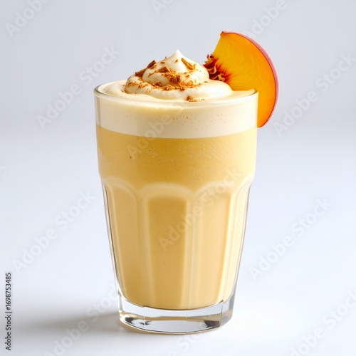 Refreshing peach smoothie topped with whipped cream and peach slice presentation on white background