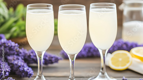 Refreshing Sparkling Lemonade with Lavender Aroma in Champagne Flutes on Rustic Wooden Table